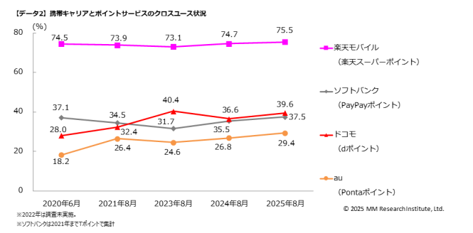 携帯キャリア(グループ企業含む)が提供するポイントサービスのクロスユース率は、楽天モバイルユーザーによる「楽天スーパーポイント」が75.5%で最も高く、2019年の調査開始以来最高となった。2位はドコモの「dポイント」で39.6%、3位はソフトバンクの「PayPayポイント」で37.5%だった(データ2)。