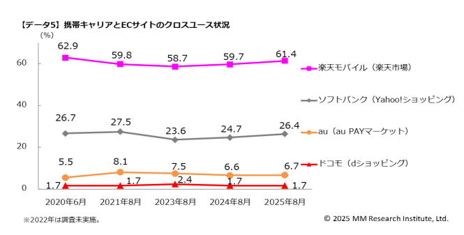 携帯キャリアが提供するECサイトのクロスユース率では、楽天モバイルユーザーによる「楽天市場」が61.4%で最も高く、前回調査から1.7ポイント上昇した。2位はソフトバンクユーザーによる「Yahoo!ショッピング」で26.4%、3位はauユーザーの「au PAYマーケット」で6.7%、ドコモの「dショッピング」は1.7%にとどまった(データ5)。楽天市場は、楽天モバイル契約者に対して常時ポイントが4倍になるSPU特典を提供しており、モバイル利用とEC利用を強固に結びつけていることが高いクロスユース率維持につながっている。