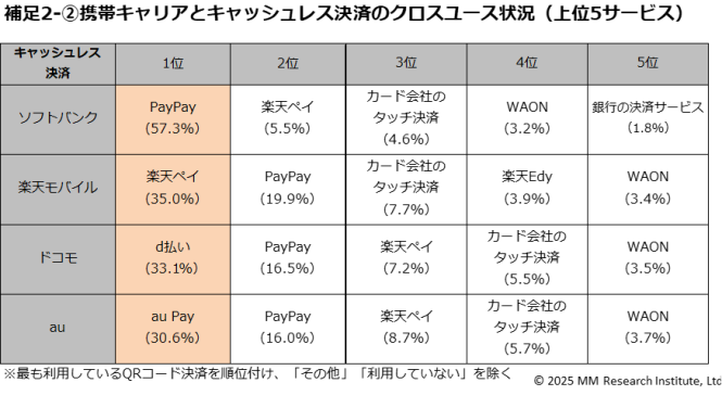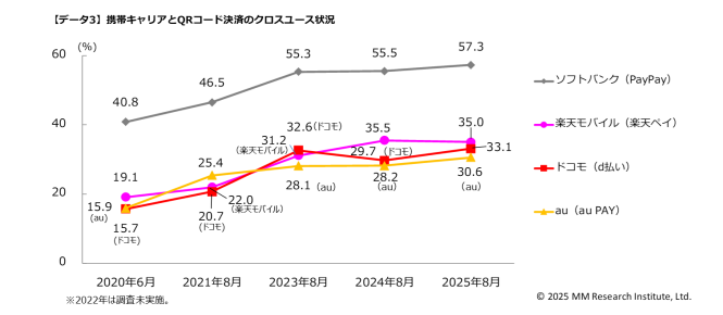 携帯キャリアが提供するQRコード決済のクロスユース率では、ソフトバンクユーザーによる「PayPay」が57.3%で最も高く、3年連続で半数超を維持した。次いで楽天「楽天ペイ」が35.0%、ドコモ「d払い」が33.1%、au「au PAY」が30.6%だった(データ3)。