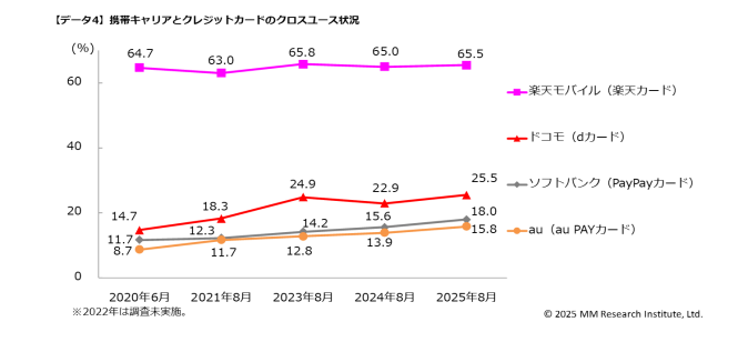 携帯キャリアが提供するクレジットカードのクロスユース率では、楽天モバイルユーザーによる「楽天カード」が65.5%で最も高く、安定的に6割超を維持。次いでドコモユーザーによる「dカード」が25.5%(同2.6ポイント上昇)と大きく伸びた。ソフトバンクの「PayPayカード」は18.0%(同2.1ポイント上昇)、auの「au PAYカード」は15.8%(同1.9ポイント上昇)だった(データ4)。
