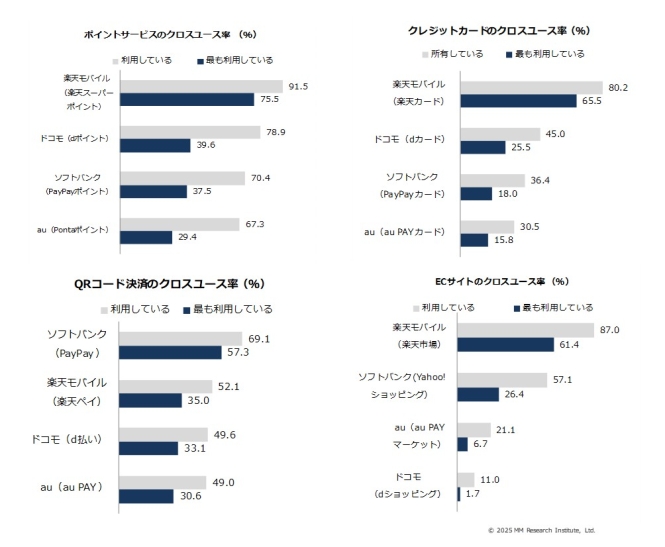 ICT市場調査コンサルティングのMM総研(略称MMRI、東京都港区、関口和一所長)は15~79歳の男女2万6970人を対象にWebアンケート調査を実施し、2025年8月時点のポイント/決済サービスの携帯キャリア別利用状況をまとめた。携帯電話利用者が、契約先の携帯キャリアが提供する各種サービスを「最も利用している」と回答した比率(以下クロスユース率)を指標とした。本調査では、①ポイントサービス②QRコード決済③クレジットカード④EC(電子商取引)サイトーーの4領域を分析した。なお、携帯電話はメインで利用しているものを対象とした。