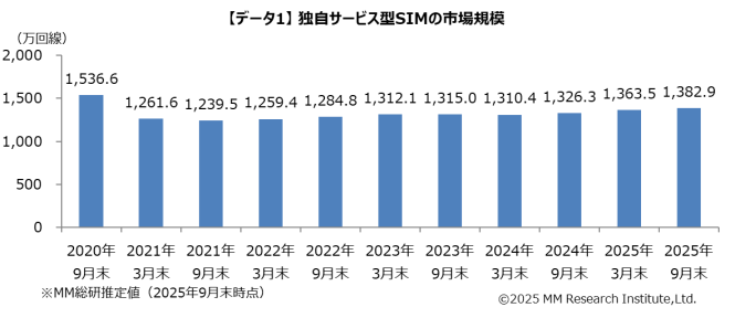 ■2025年9月末の独自サービス型SIM回線契約数は1382.9万回線(前年同月末比4.3%増)