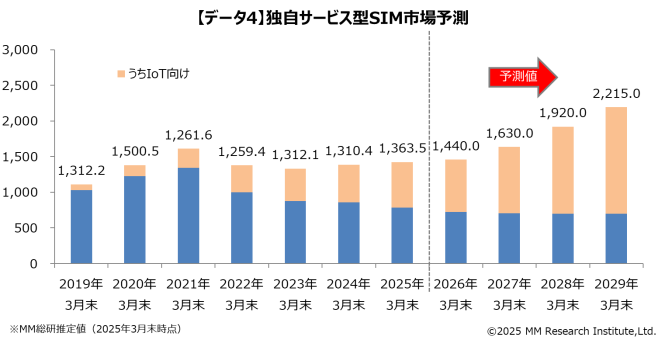 MM総研では2026年3月末の独自サービス型SIMの回線契約数を1440万回線(前年同月末比5.6%増)と予測する。ネットワークカメラなどの法人向けIoT用途のSIMが主力となり、引き続き市場が拡大すると予想する(データ4)。