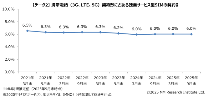 2025年9月末時点の携帯電話(3G、LTE、5G)契約数は2億2962万回線。うち独自サービス型SIMの契約数比率は6.0%で、前年同月末比横ばいとなった(データ2)。
