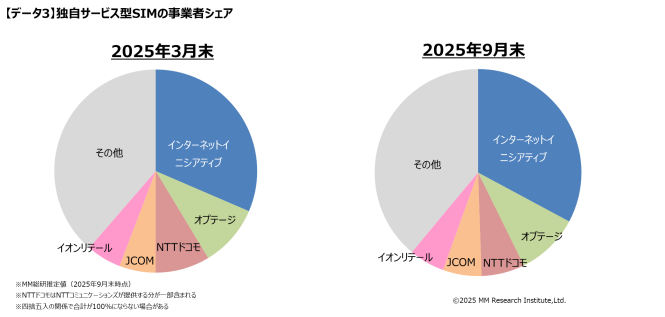 3位のNTTドコモは2023年7月に吸収したNTTレゾナントが提供していた「OCNモバイルONE」の新規受け付け停止により、「ドコモMAX」や「ドコモポイ活プラン」などメインブランドやオンライン専用プランへの乗り換えキャンペーンを実施した結果、ユーザーが流出し、独自サービス型SIMのシェアは2025年3月末に比べて低下した。