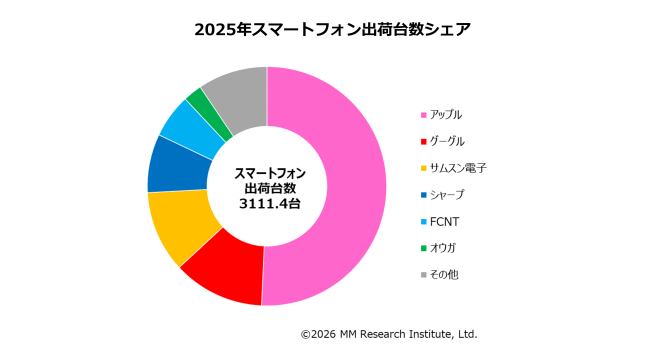 2025年のメーカー別総出荷台数シェア1位はアップルで、2012年から14年連続で1位を獲得した。