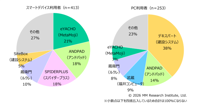 事業者別シェアは、専門工事会社を含む建設業全体では1位が建設システムの「デキスパート」で18%、2位がアンドパッド(東京都千代田区)の「ANDPAD」で17%、3位がMetaMoJiの「eYACHO」で16%と続いた。3位までは1ポイント差ずつのほぼ横並び状態だった。