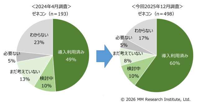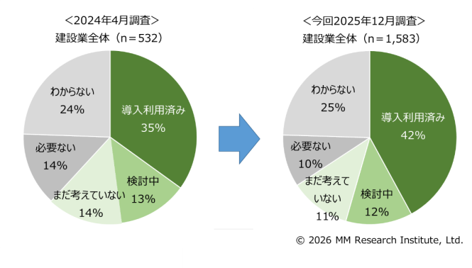ICT市場調査コンサルティングのMM総研(略称MMRI、東京都港区、横田英明所長)は年商10億円以上の建設業を対象にWebアンケート調査を実施し、施工管理支援アプリの利用動向をまとめた。調査では建設業で同アプリを実際に利用する立場の施工管理・設計・施工従事者1,583人を対象とした。調査結果によると、施工管理支援アプリを利用しているエンドユーザーは42%だった。2024年4月の働き方改革関連法の適用直後に実施した前回調査の35%から7ポイント上昇した。現場の施工よりも施工管理業務が多いゼネコン(総合建設会社)に絞ると現在の利用率は60%に達した。前回の法適用直後の49%から11ポイント上昇した。当時は法適用までに一気に導入が進むと思われていたが、実際はエンドユーザーが使い慣れる時間なども必要なため、効率化手段の1つとしてジワジワと導入が進んでいる。また、同アプリの導入を検討中の企業も12%あり(ゼネコンでは10%)、今後も導入が進む見通しだ(データ1・2)。